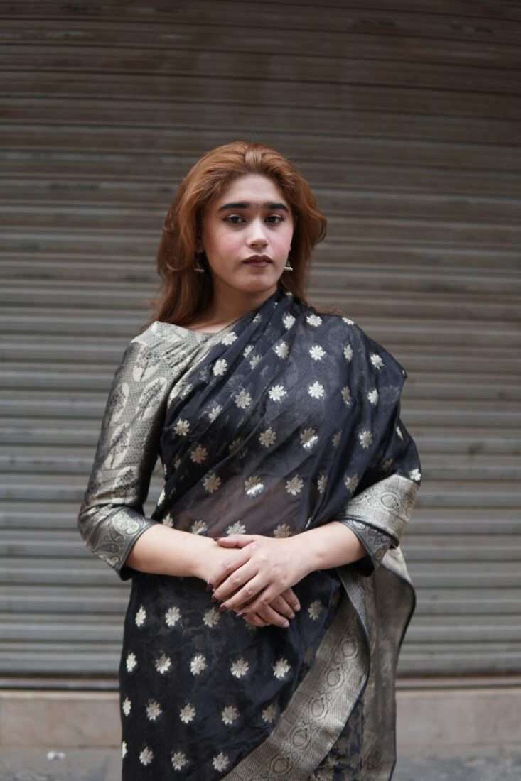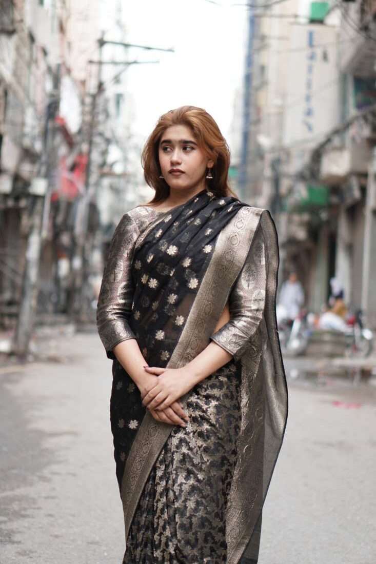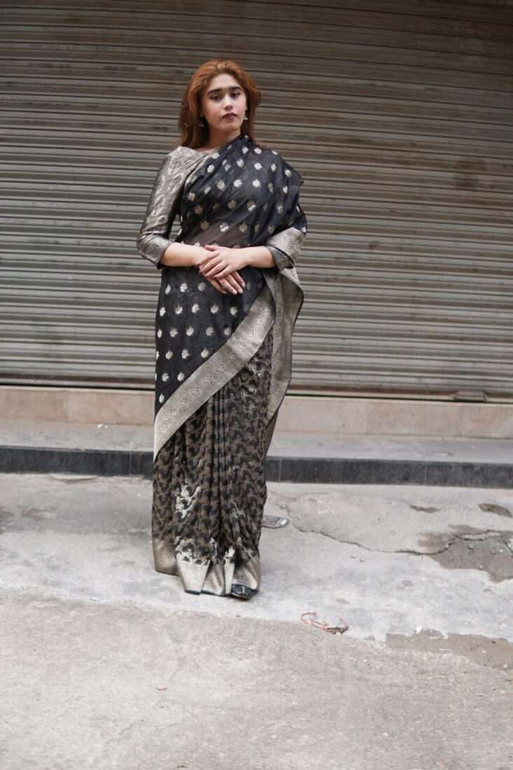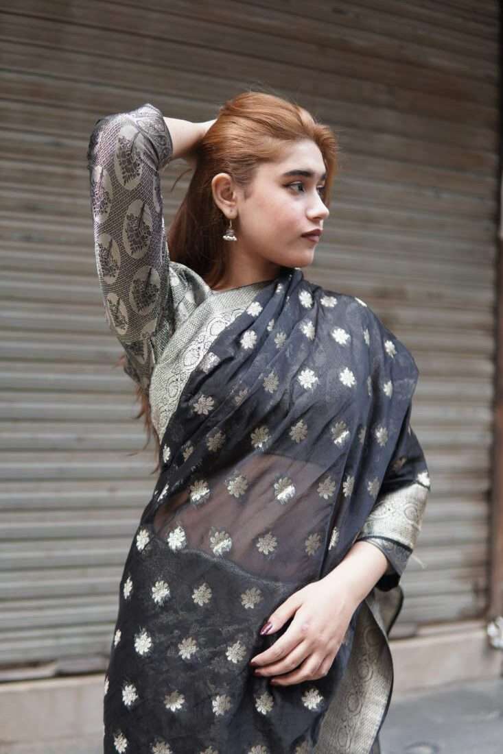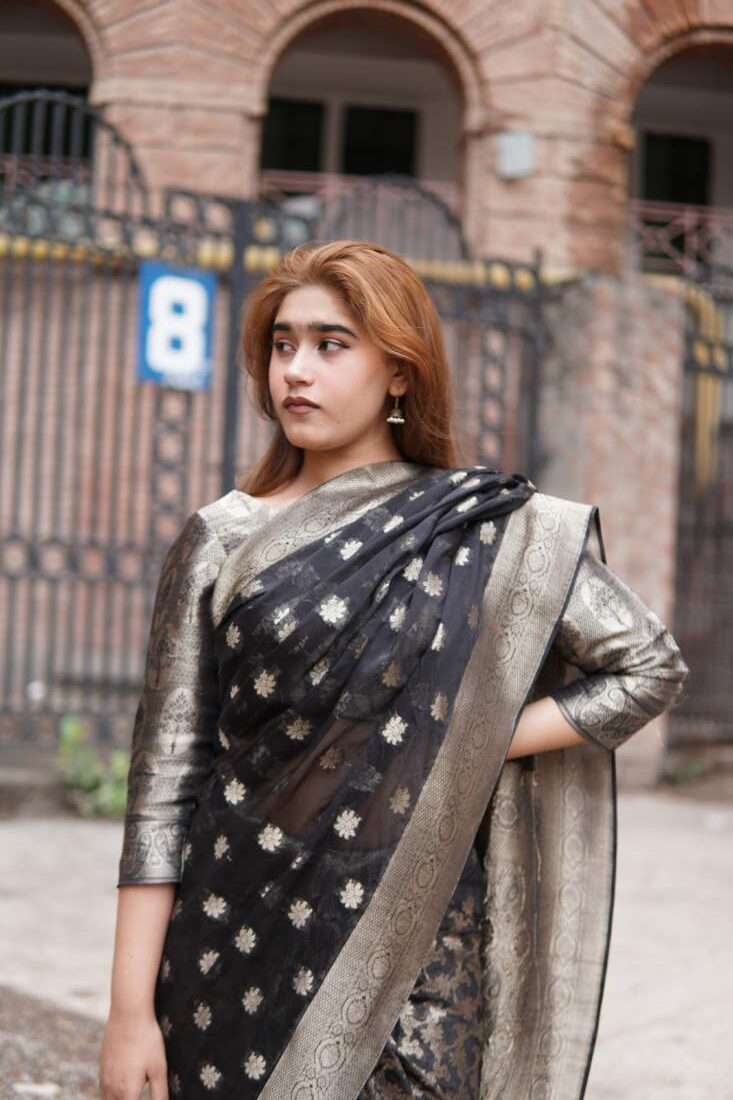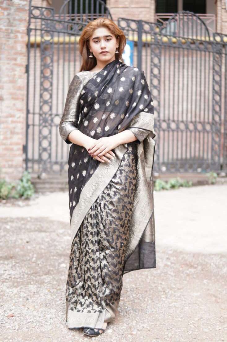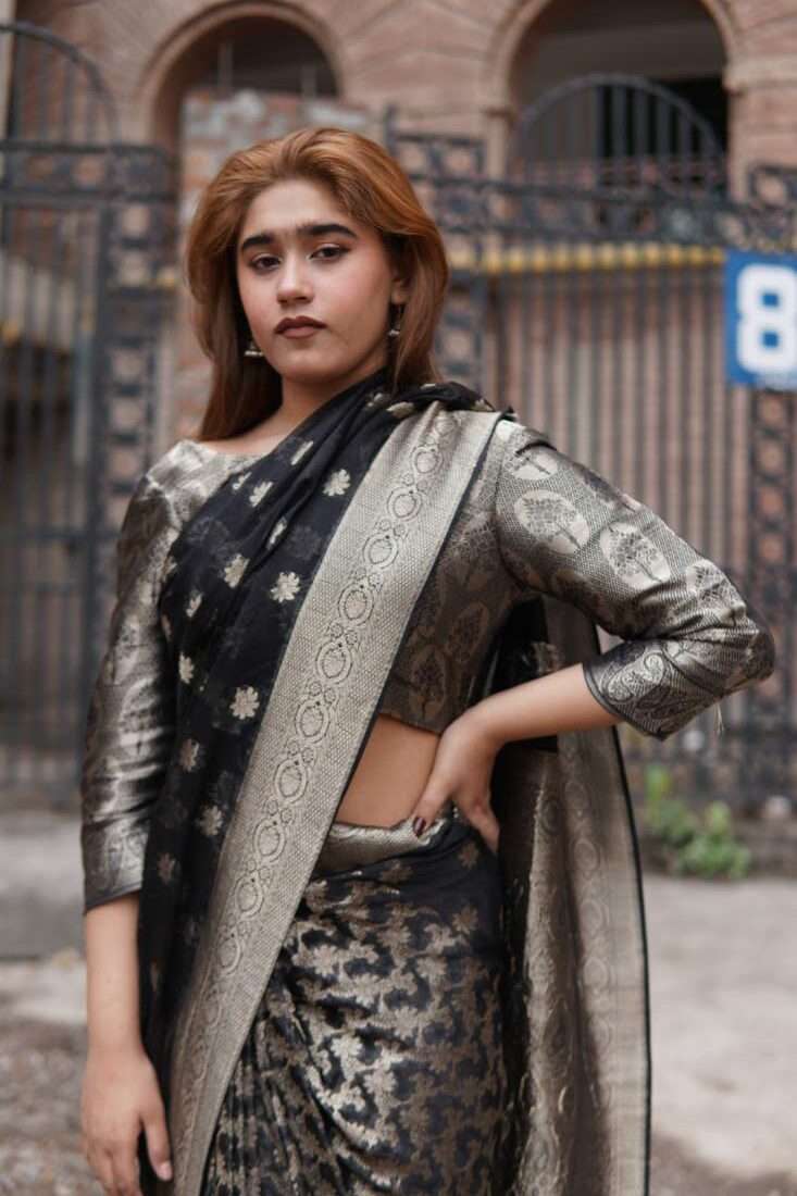 A study in dramatic elegance, the Aurelia saree is a stunning masterpiece crafted from luxurious silk jamawar. The deep black canvas is brought to life with intricate, scattered floral motifs that catch the light, while a bold, ornate gold border adds a touch of regal opulence. Paired with a matching metallic self-textured blouse, this saree is the perfect choice for a sophisticated evening, a festive celebration, or any occasion that calls for a touch of timeless glamor.