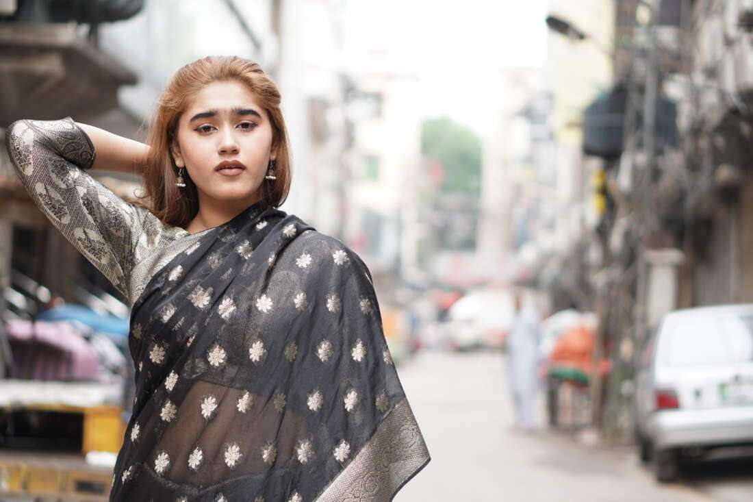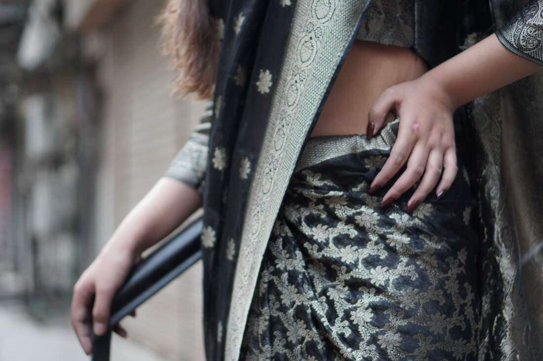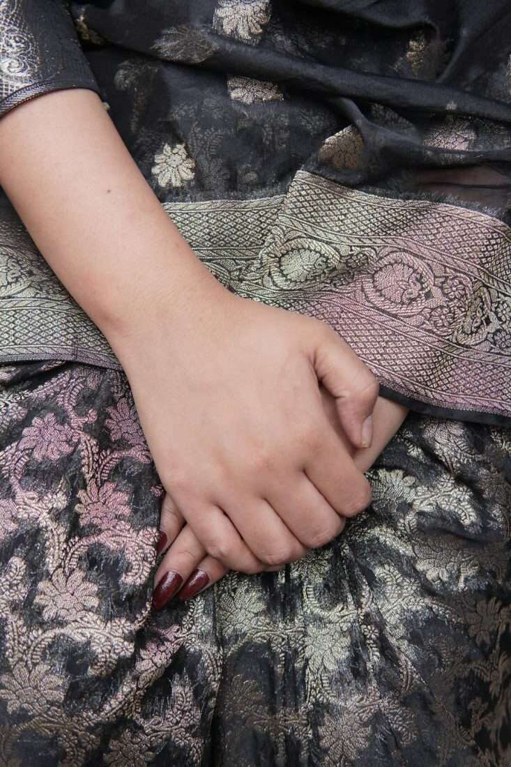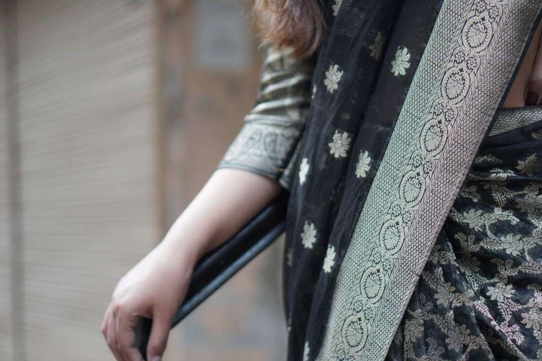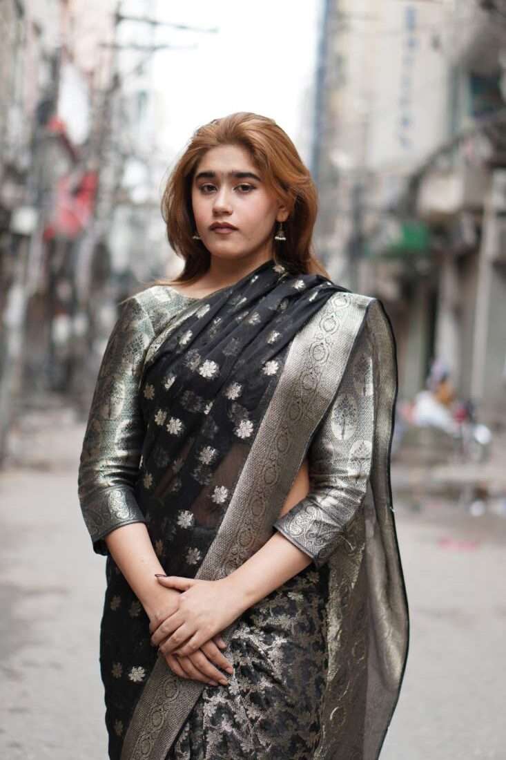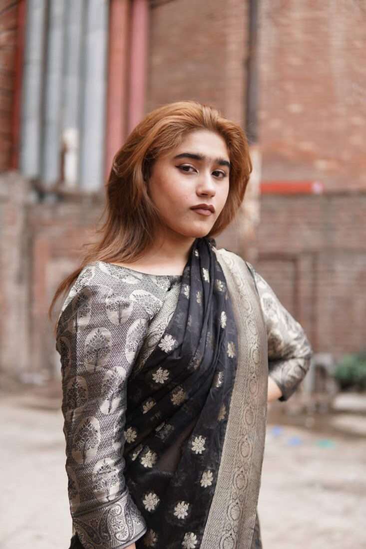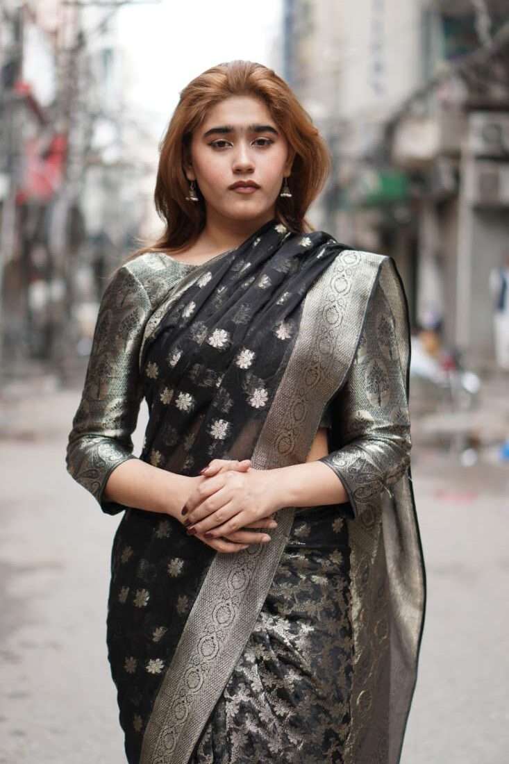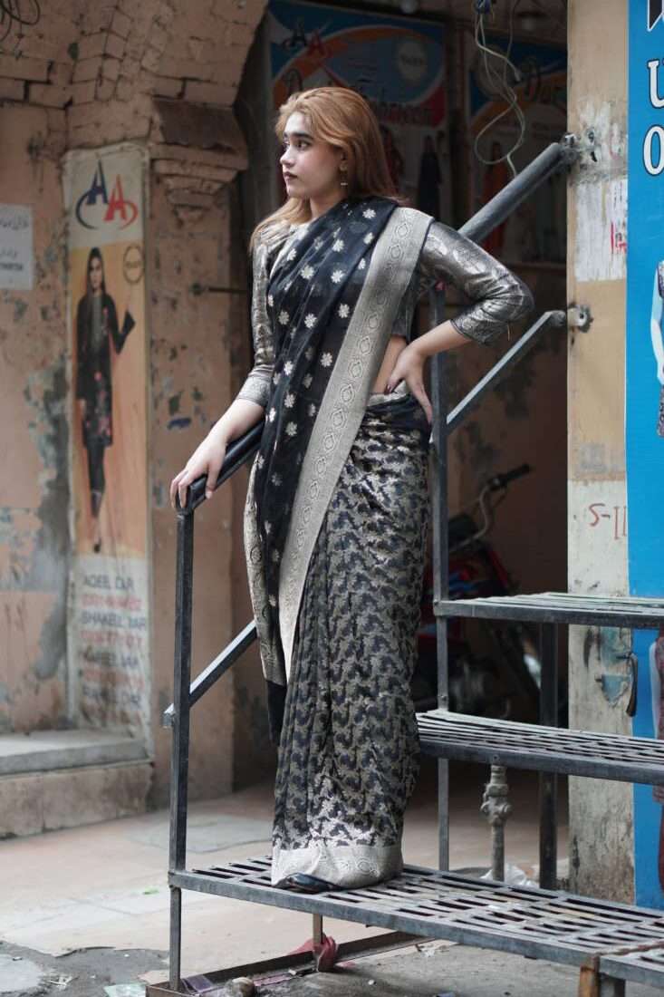 A study in dramatic elegance, the Aurelia saree is a stunning masterpiece crafted from luxurious silk jamawar. The deep black canvas is brought to life with intricate, scattered floral motifs that catch the light, while a bold, ornate gold border adds a touch of regal opulence. Paired with a matching metallic self-textured blouse, this saree is the perfect choice for a sophisticated evening, a festive celebration, or any occasion that calls for a touch of timeless glamor.