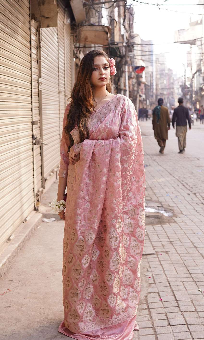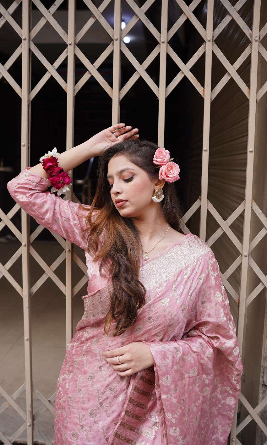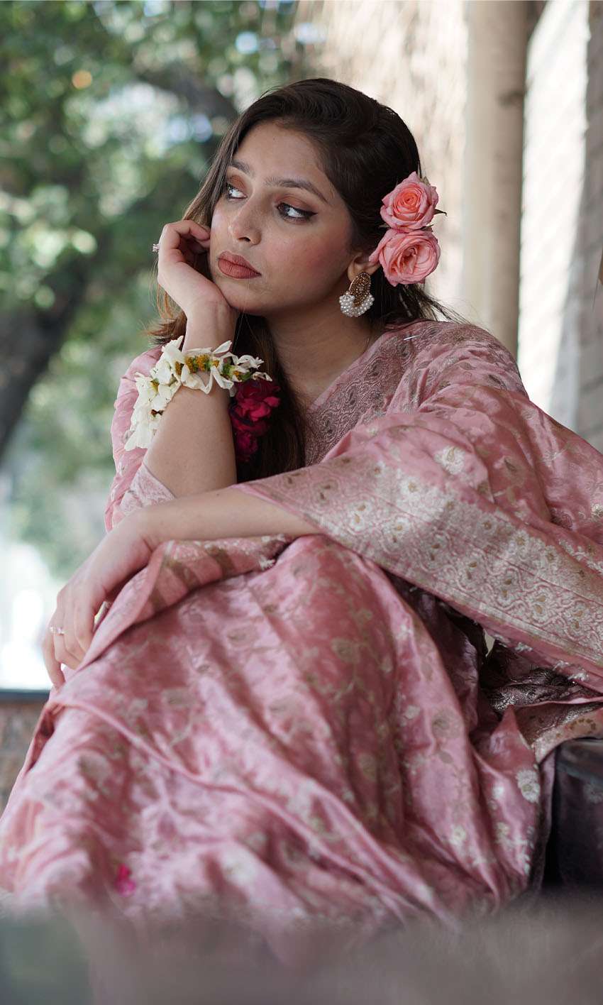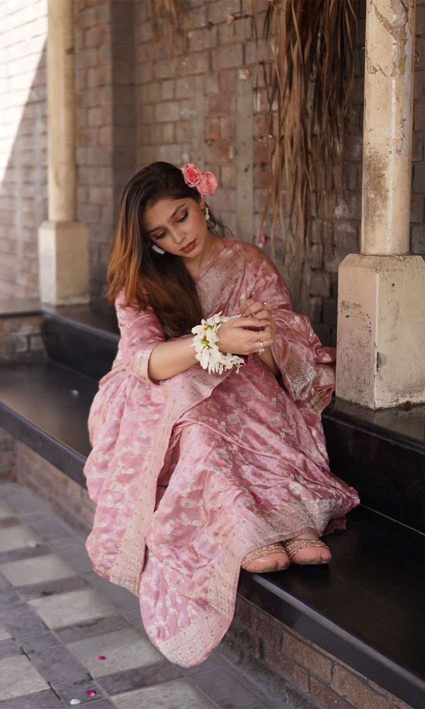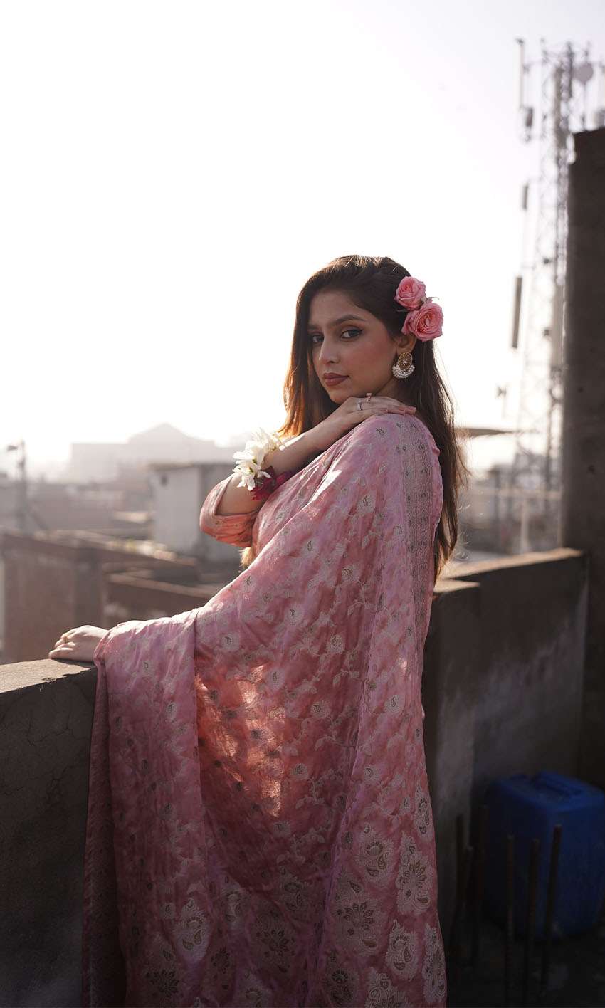 This blush pink silk jamawar saree is a timeless statement of elegance. With golden tilla floral motifs inspired by Mughal art, it brings regal charm to festive or wedding settings.
