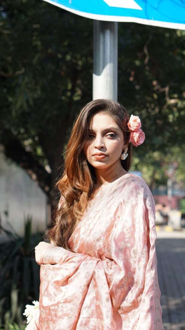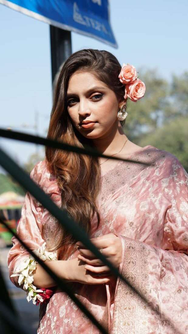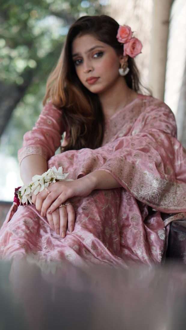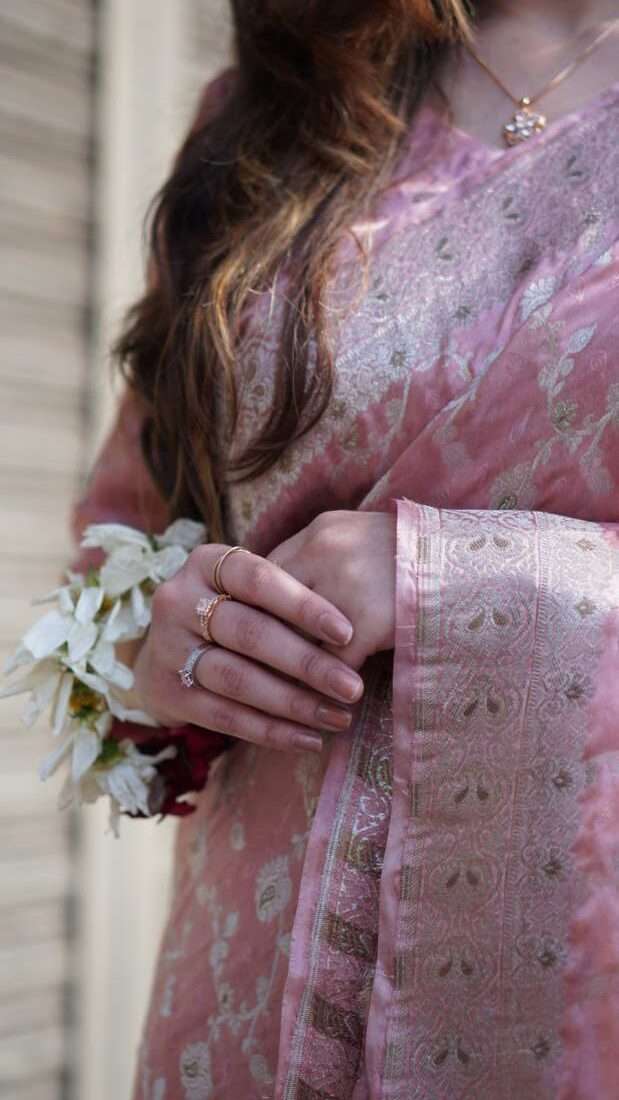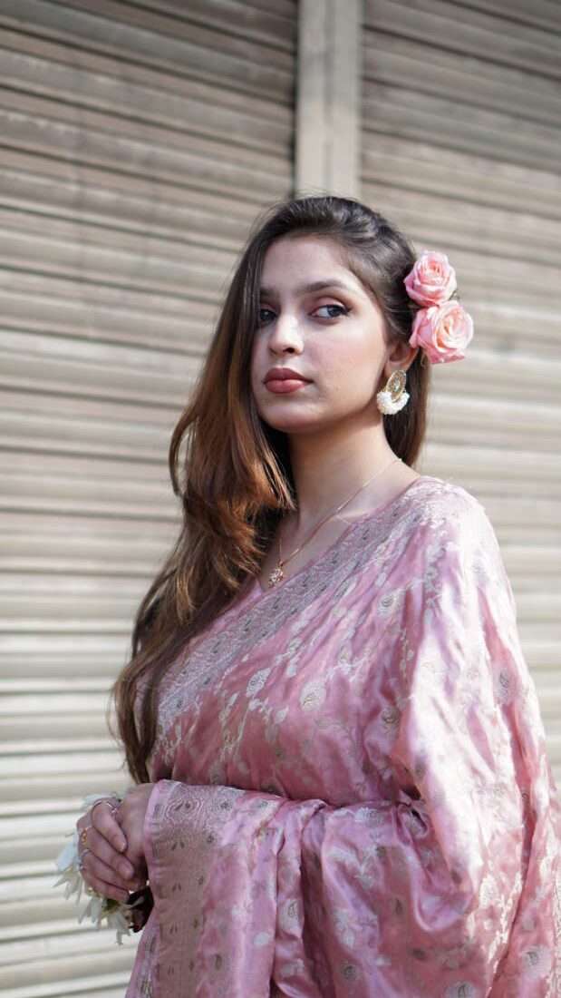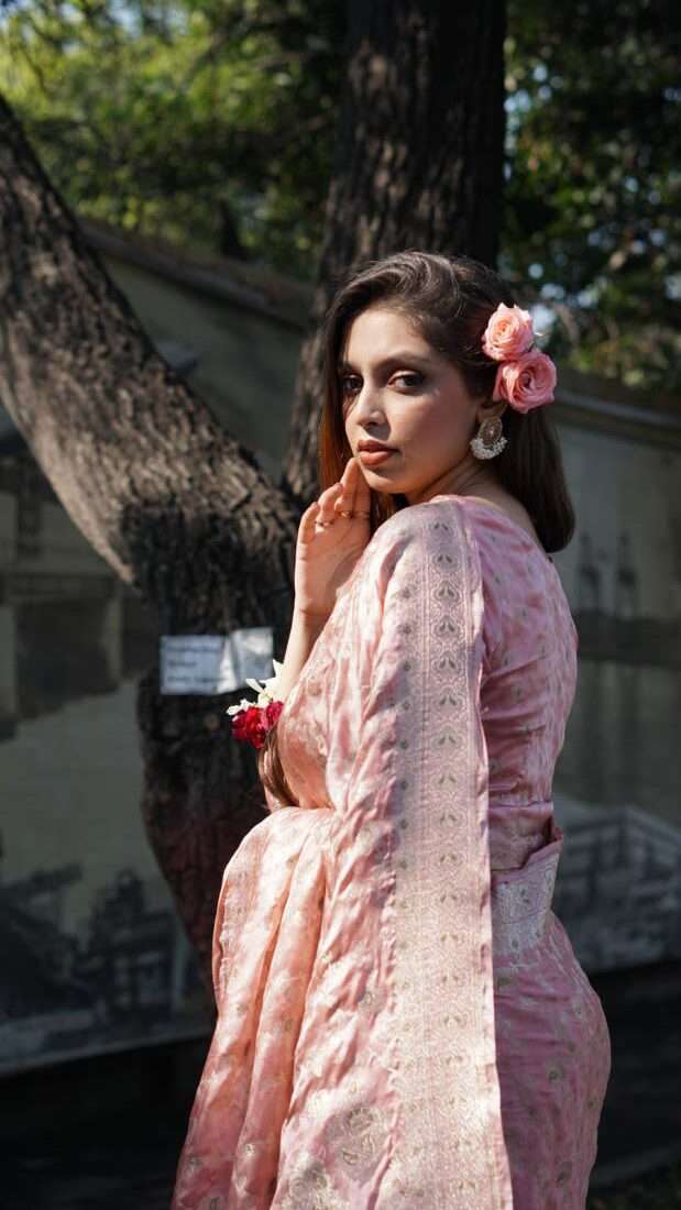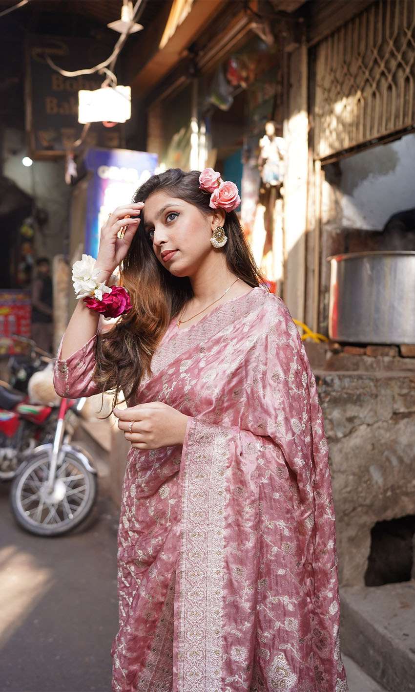 This blush pink silk jamawar saree is a timeless statement of elegance. With golden tilla floral motifs inspired by Mughal art, it brings regal charm to festive or wedding settings.