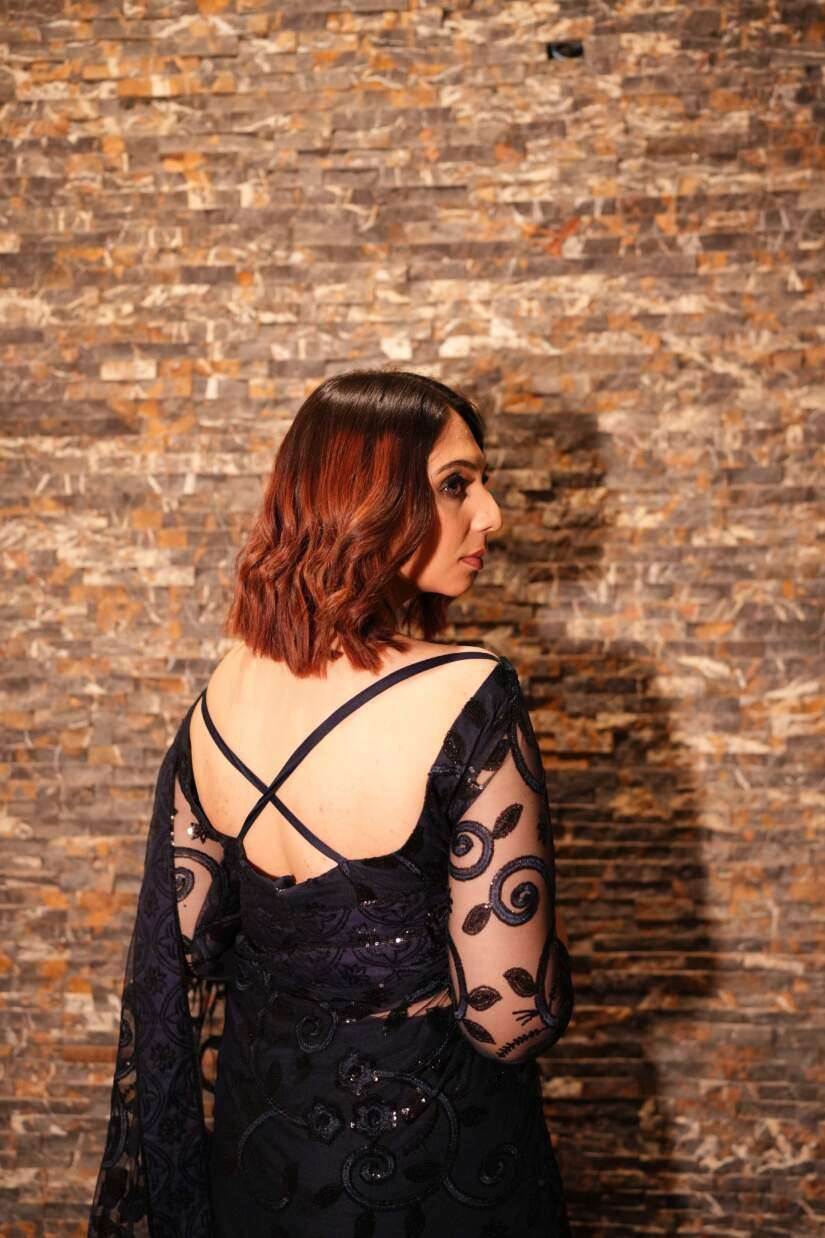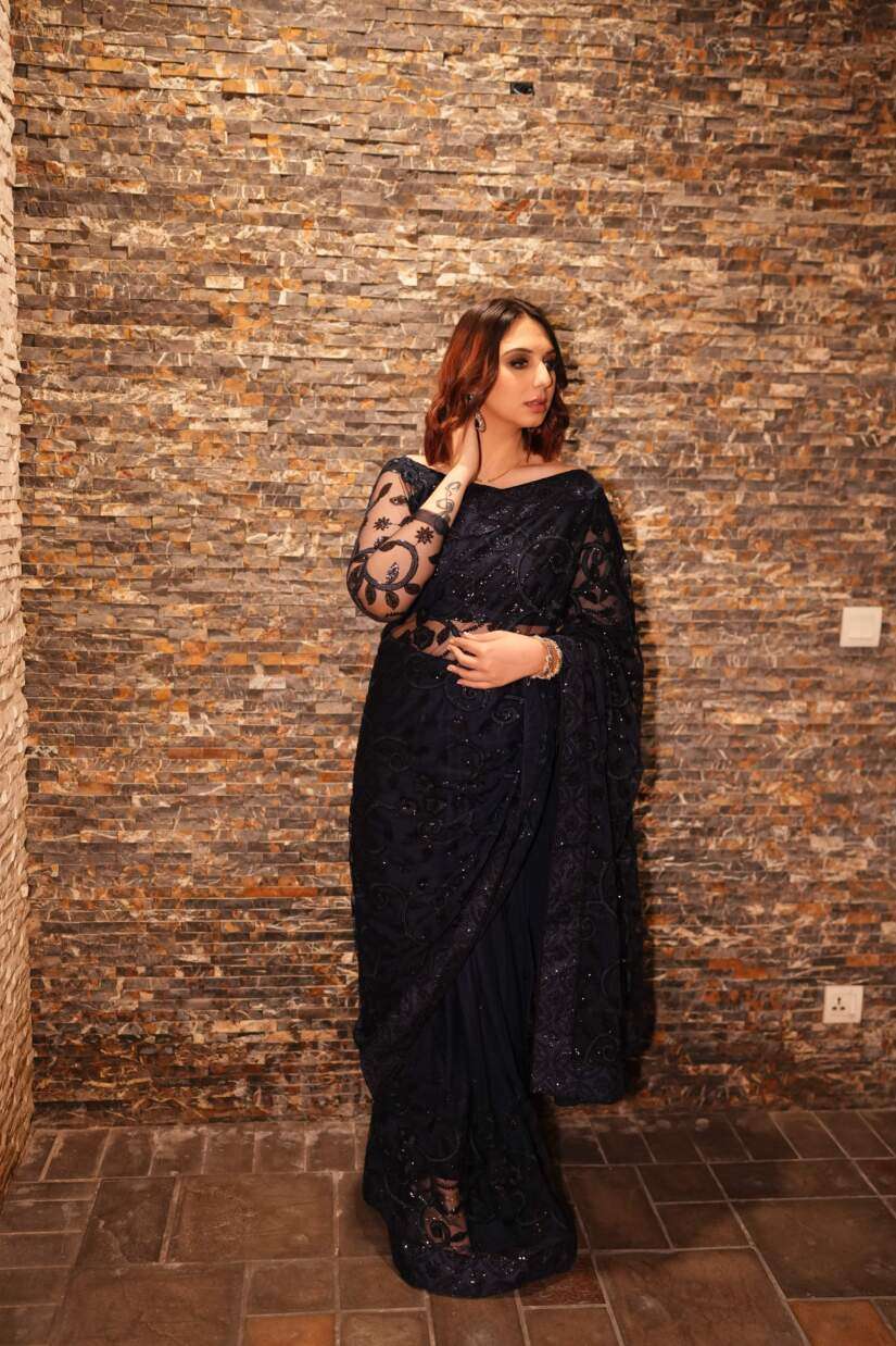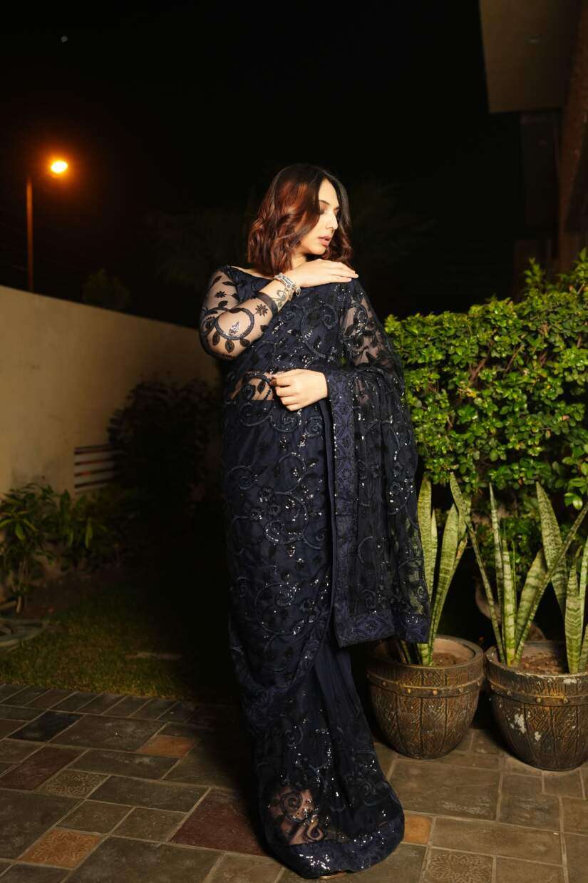 Enchant with ethereal beauty in this deep navy blue net saree, lavishly embellished with shimmering sequins. The delicate net offers an airy drape, while the sequin embroidery adds glamorous sparkle.