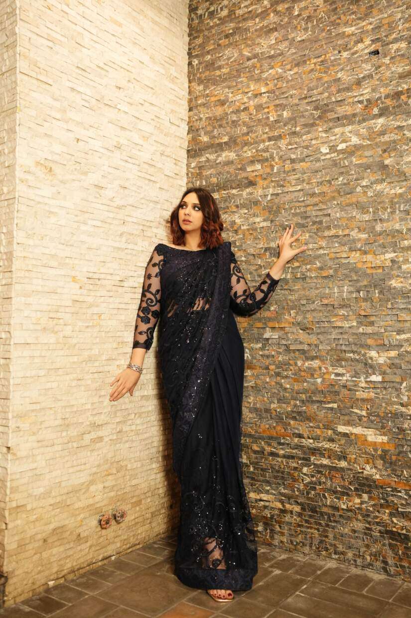 It comes with a full-sleeved, sequin-embellished net blouse that complements the saree’s allure.