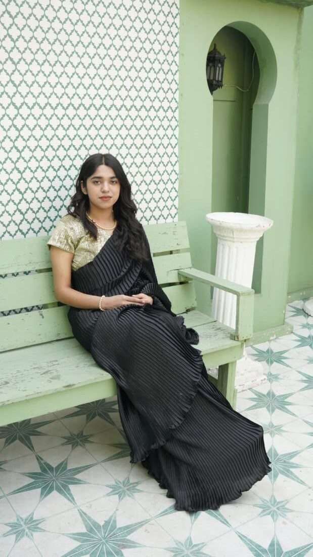 A modern classic, this jet-black pleated cotton saree exudes graceful movement and minimalist elegance. Paired with a gold glitter blouse, it adds just the right touch of sparkle for formal gatherings, evening events, or festive occasions.